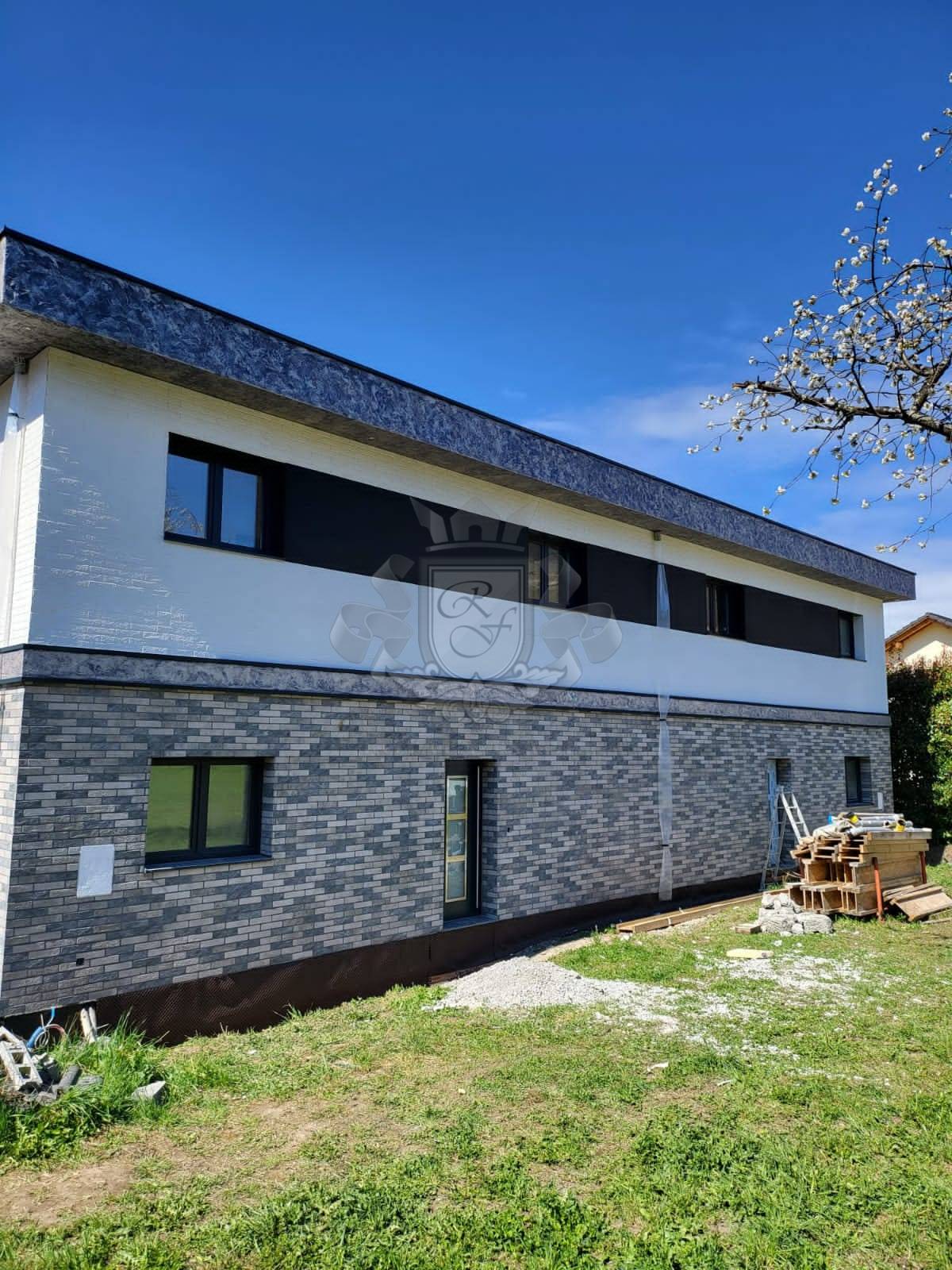 клінкерна термопанель ROYAL FASADE в основі утеплювач ПСБС (EPS-90) з плиткою Голден Тайл (для першого поверху - мікс Лондон антрацит та Севен тонз сірий, для другого - Стренд білий та Стренд Чорний) на основі спіненого пінополістиролу товщиною 120 мм.