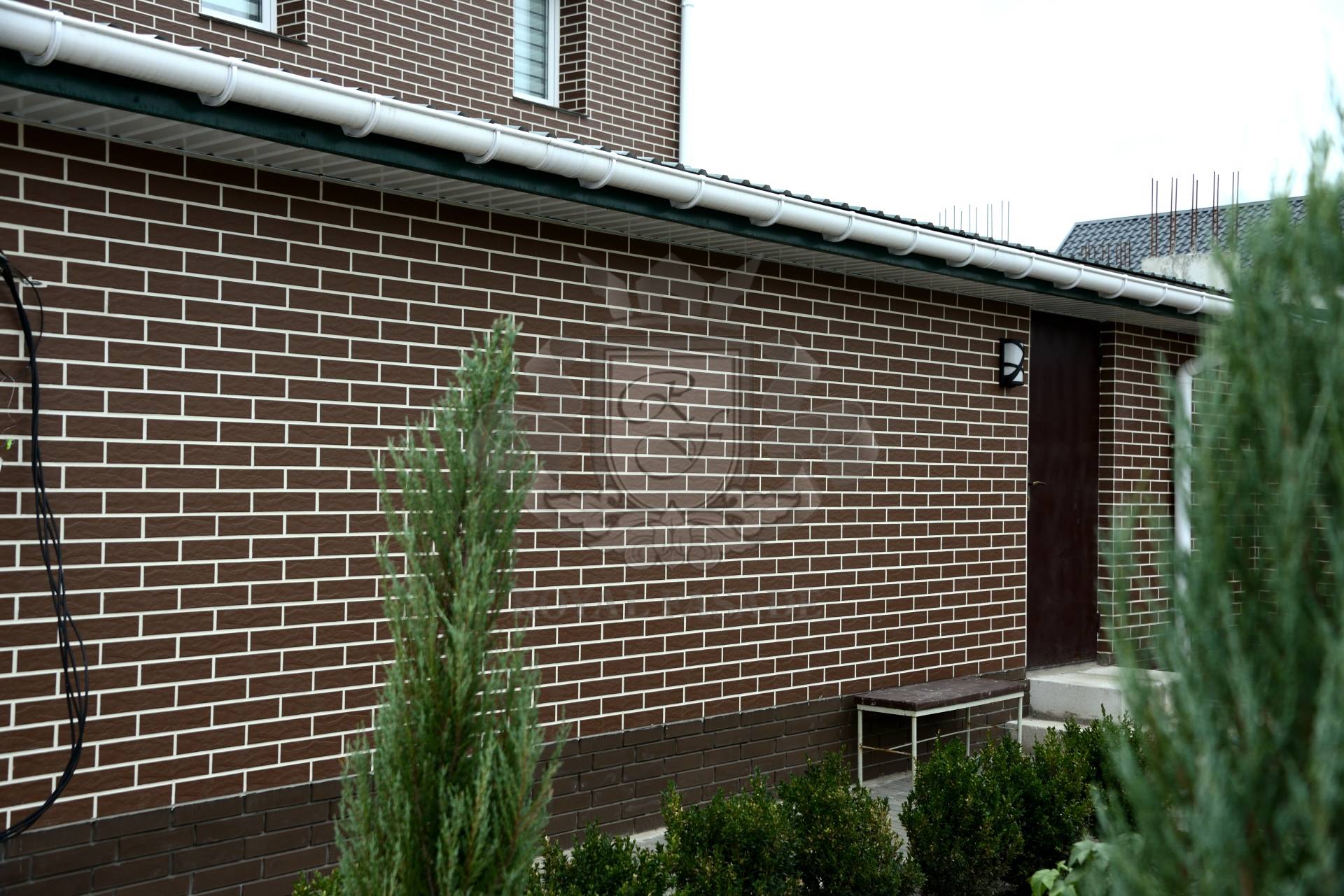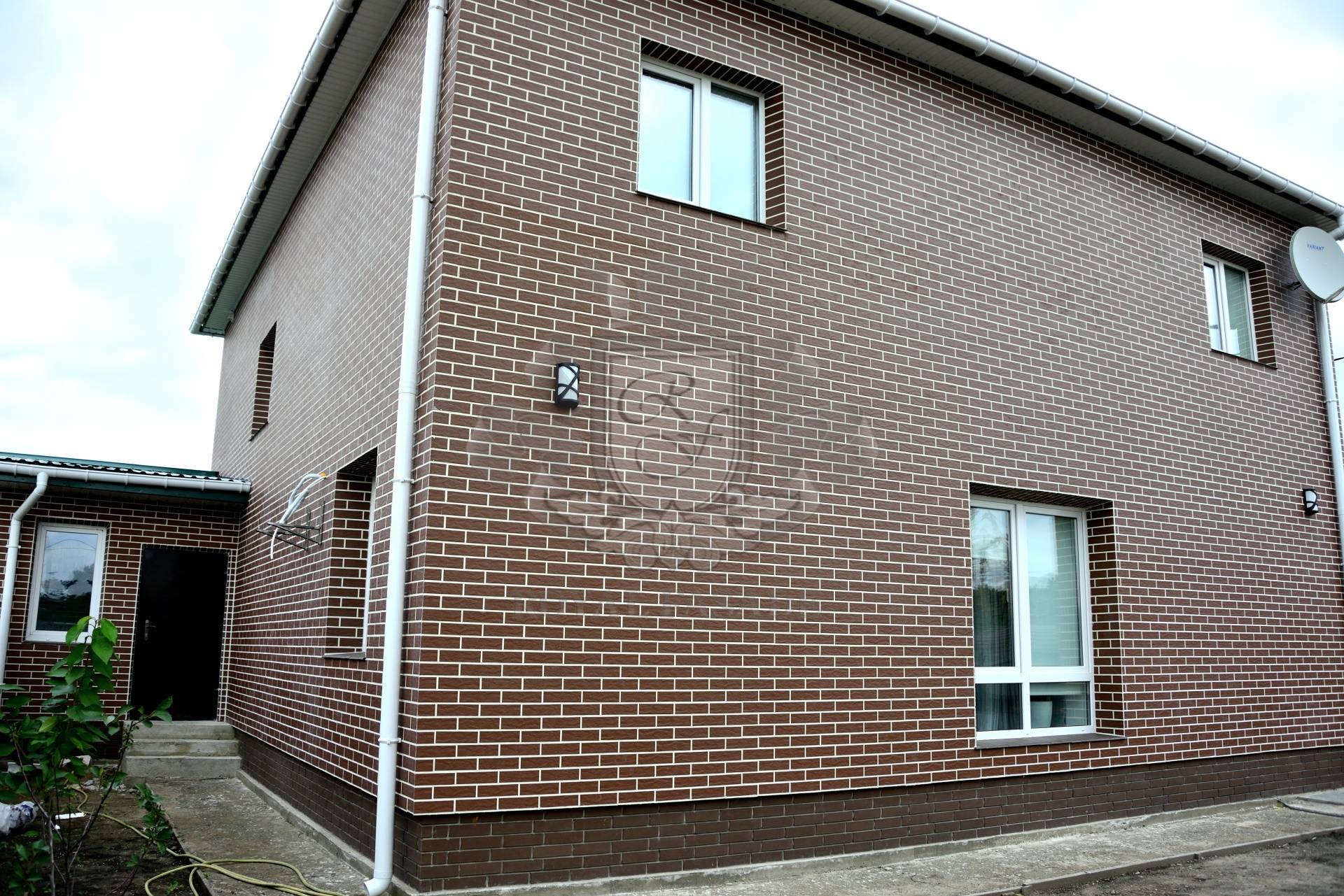 Использовано: Клинкерную термопанель TM ROYAL FASADE в основе ПСБ-С25 80мм, плитка CERRAD Коричневая рустикальная (braz rystykalne) (Польша)Затирочную смесь: POLIPLAST белая.