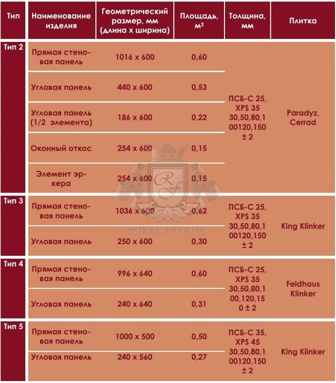 Таблиця 2. Види клінкерних термопанелей Royal Fasade™ в залежності від виробника плитки (геометричні розміри) і утеплювача
