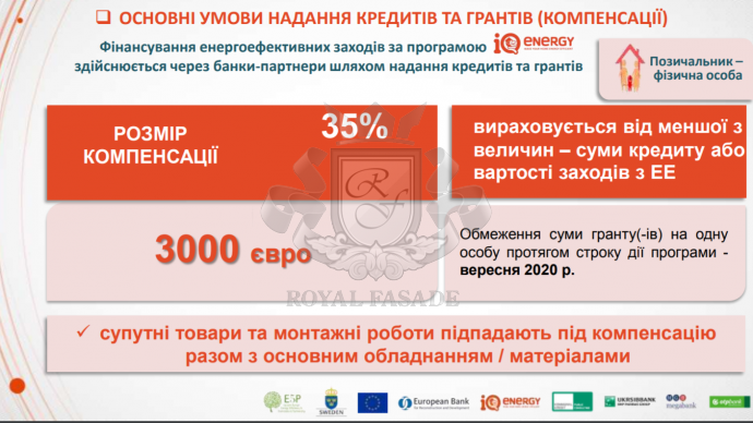 Ставши клієнтом Royal Facade, ви отримуєте можливість отримати кредит в розмірі не більше 15 000 євро і грант (компенсацію) до 3000 євро. Компанія Роял Фасад виробляє термопанелі клінкеру різної конфігурації, енергоефективність яких перевищує 20%, тому іноземні партнери та фонди готові співпрацювати з програмою Iqenergy і через українські банки: